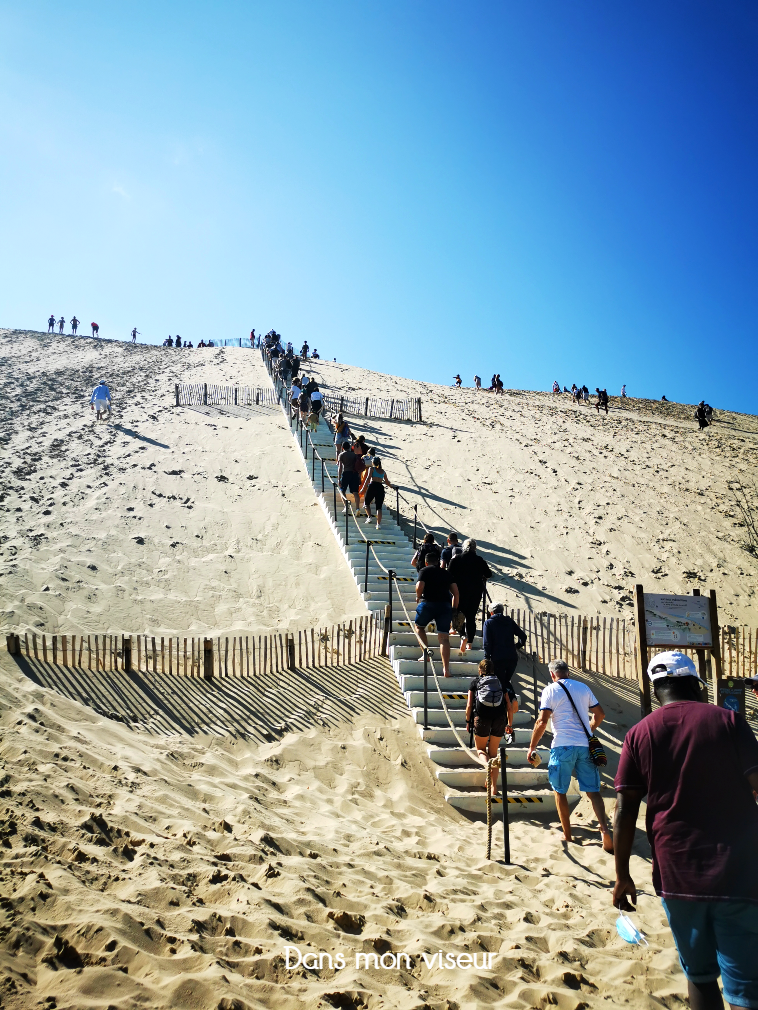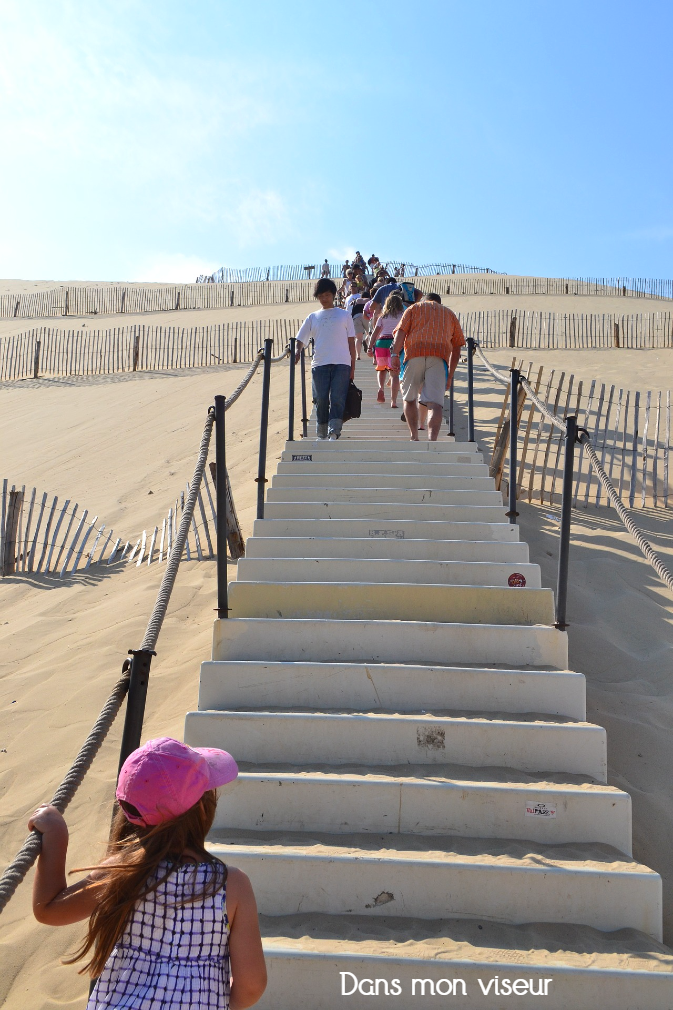 140 ! C’est le nombre de marches qu’il faudra monter pour accéder au plus beau panorama sur le Bassin d’Arcachon. En fait ca se fait relativement vite et bien (même pour les peu sportifs et asthmatiques comme moi). Et après l’effort, le réconfort. Arrivé au sommet de l’impressionnante dune de sable fin, l’époustouflante vue sur le bassin d’Arcachon, la forêt des Landes, le banc d’Arguin, le Cap Ferret a achever de me couper le souffle.
