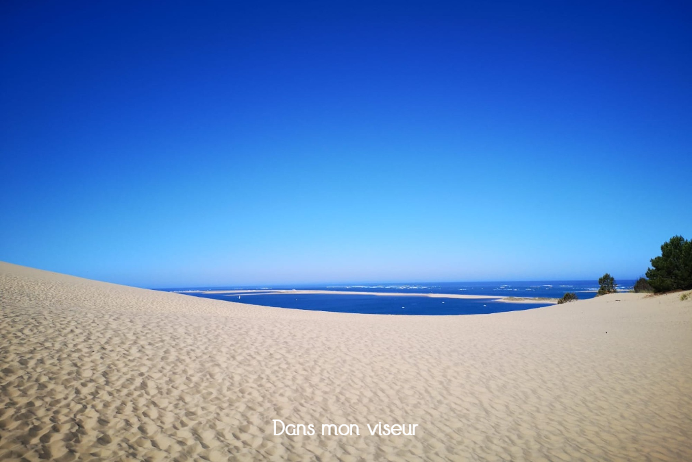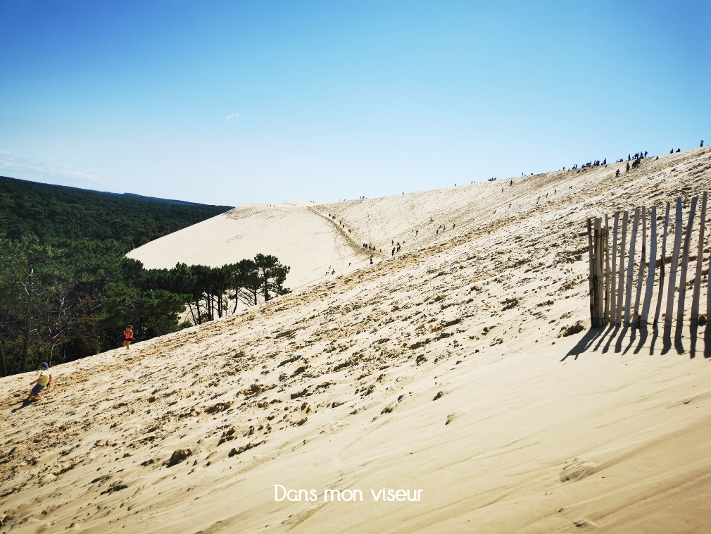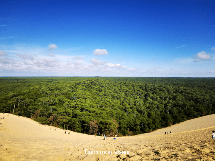 Même si nos yeux sont irrésistiblement attirés vers l’océan, cette dune est aussi un point de vue magique sur la forêt des Landes de Gascogne. Cette étendue verte à perte de vue, et puis l’odeur des pins en plein été ont quand même quelque chose d’assez intriguant. On se sent un peu petit face à tout ça !