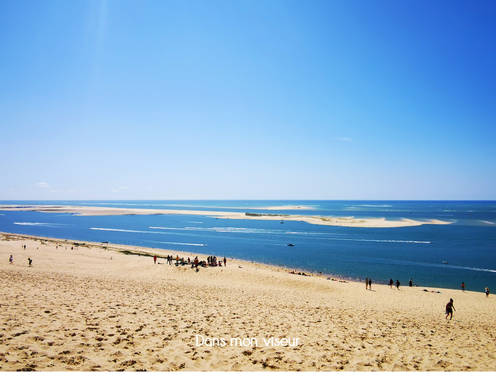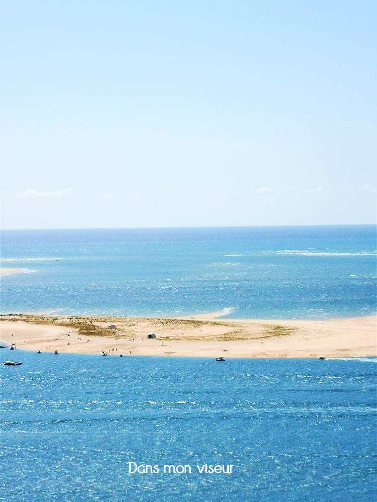 Cette année, la destination de mes vacances de juillet était le Cap Ferret, que je ne connaissais toujours pas. Situé à l’opposé de la dune dont il est séparé par le Bassin d’Arcachon, on se rend vraiment compte de l’ampleur du phénomène. Vue d’en face et même de loin, elle parait si imposante ! Et elle l’est, puisqu’elle mesure pas moins de 106m de hauteur et 3km de long, ce qui en fait la plus haute d’Europe. Depuis la pointe du Cap Ferret, on reconnait facilement son immense silhouette.