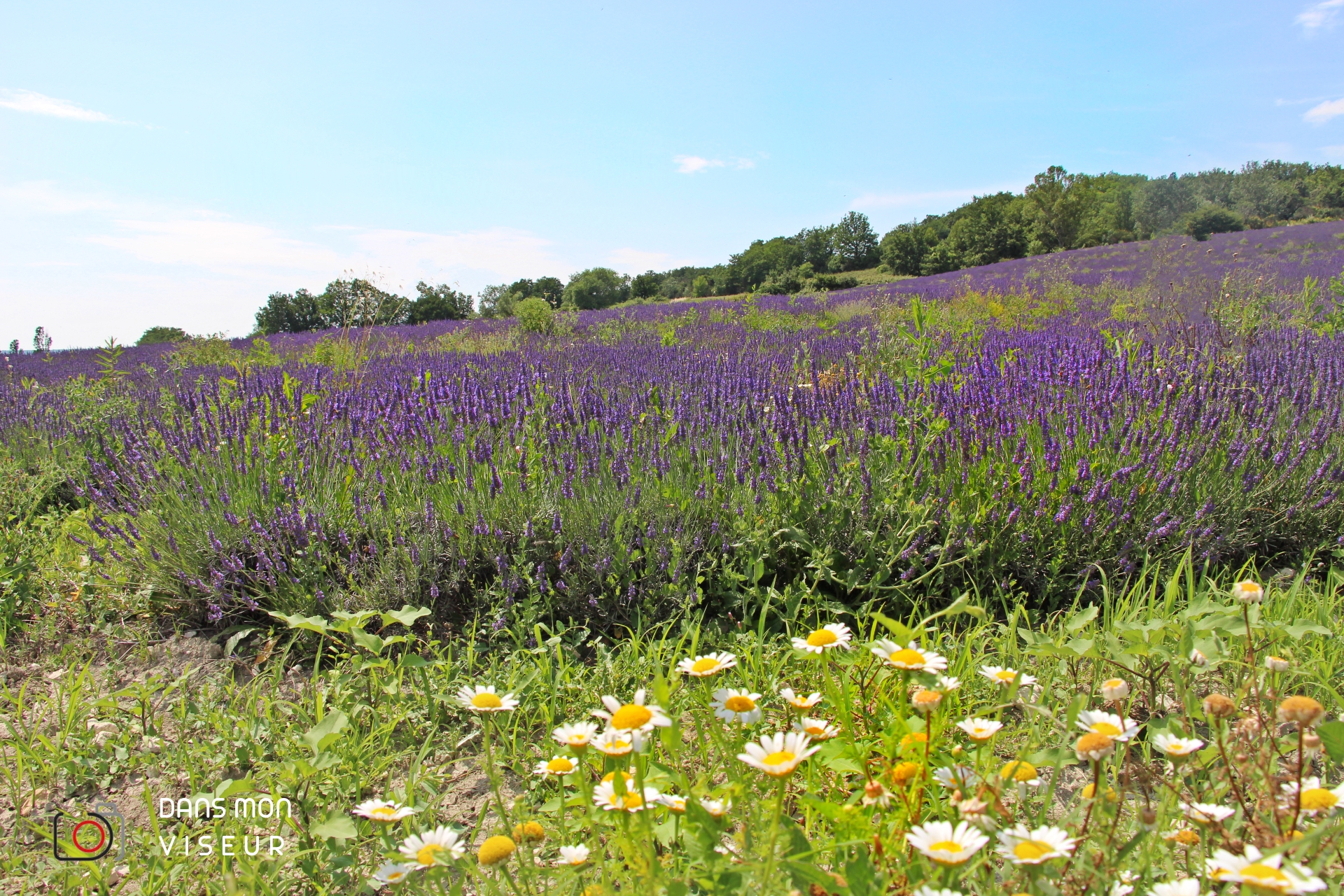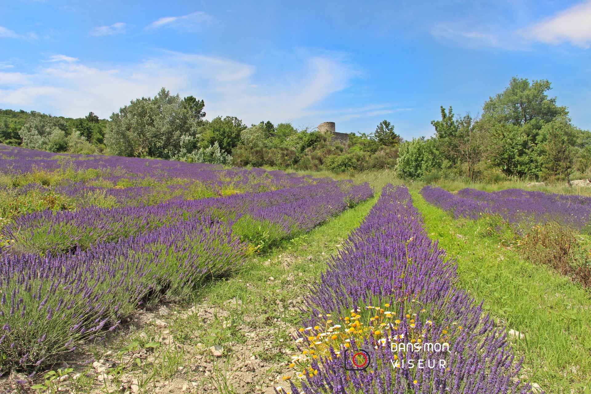 Ma route s’éloigne quelque peu, en direction de Chamaret et Chantemerle les Grignan. Des étendues violettes à perte de vue qui sentent bon la Provence. Non loin de la tour de Chamaret, je trouve un nouveau terrain de jeu. Pour mon plus grand plaisir personnel je constate à nouveau cette année une évolution dans la culture de ces fleurs puisque les champs sont beaucoup moins « propres » qu’il y’a quelques années. Signe de l’arrêt d’utilisation des pesticides et autres produits chimiques, des fleurs sauvages sont visibles au milieu des rangs bien alignés. Certes c’est moins joli pour les photos.
